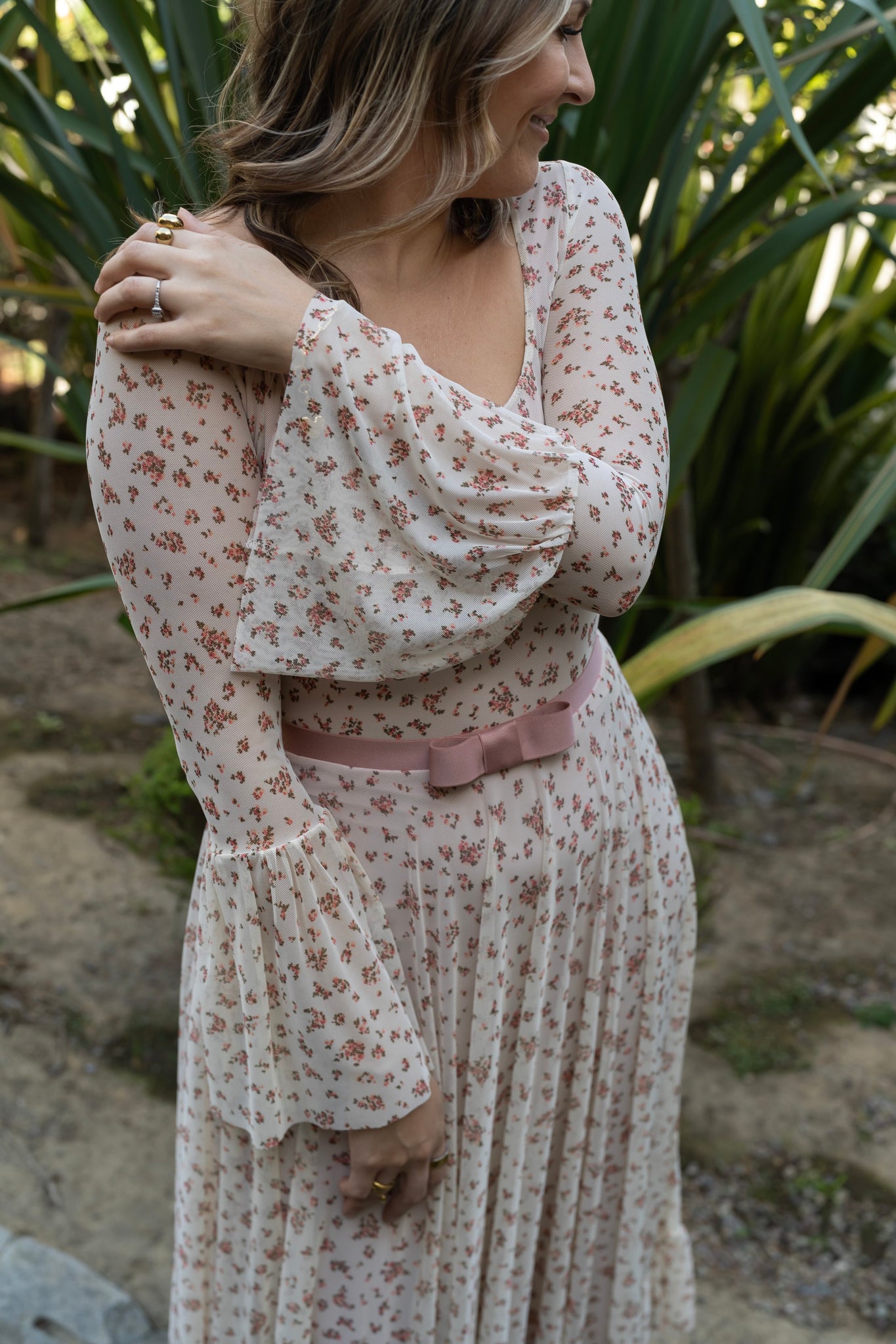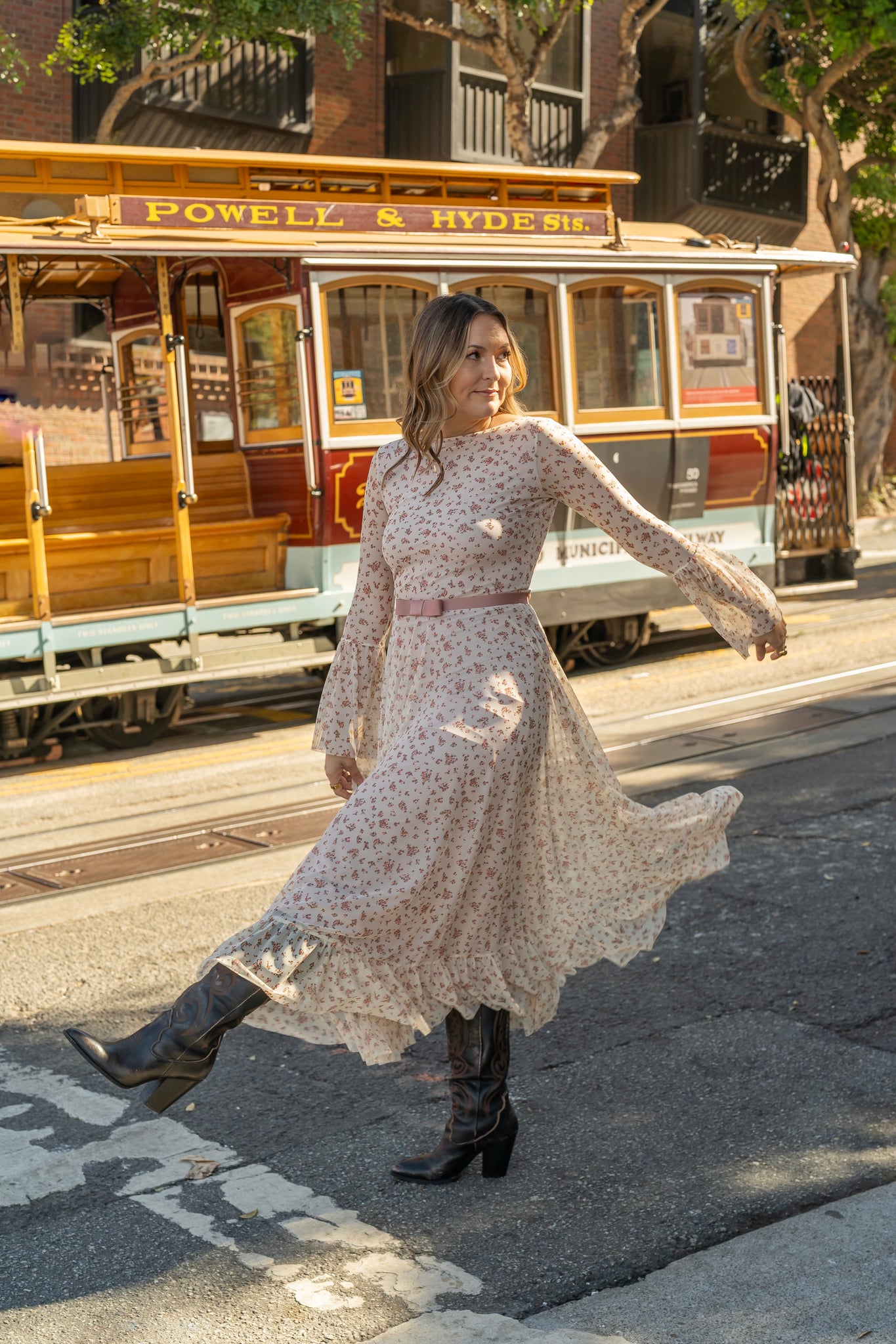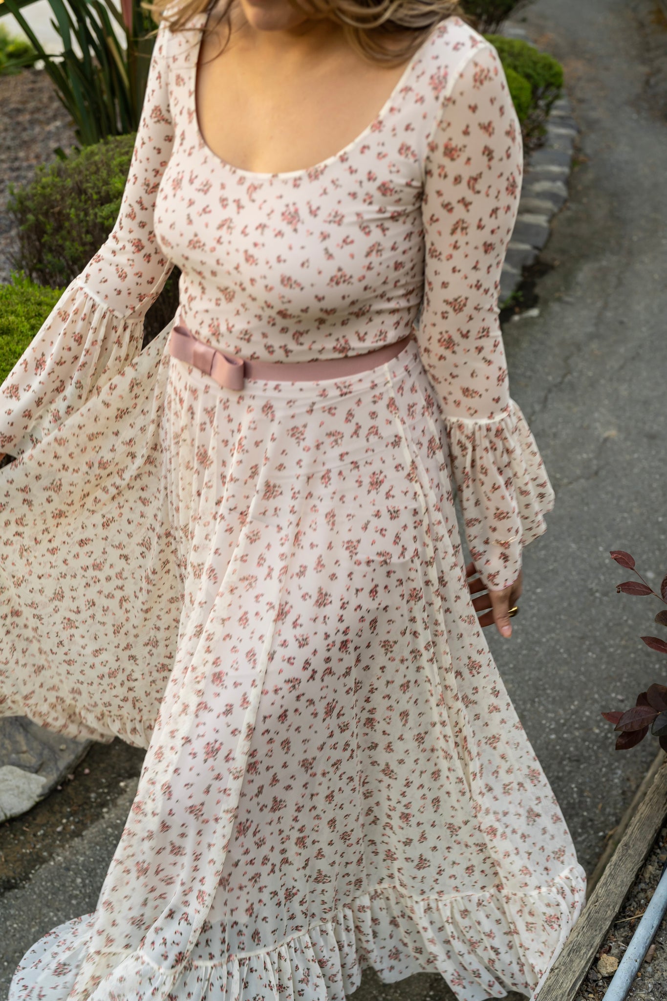 This two piece set features a unique two way top that can be worn in one position that showcases a boat neck or a second position that features a scoop neck! The bottom features a circle skirt with a ruffled edge. Set can be worn together or independently.