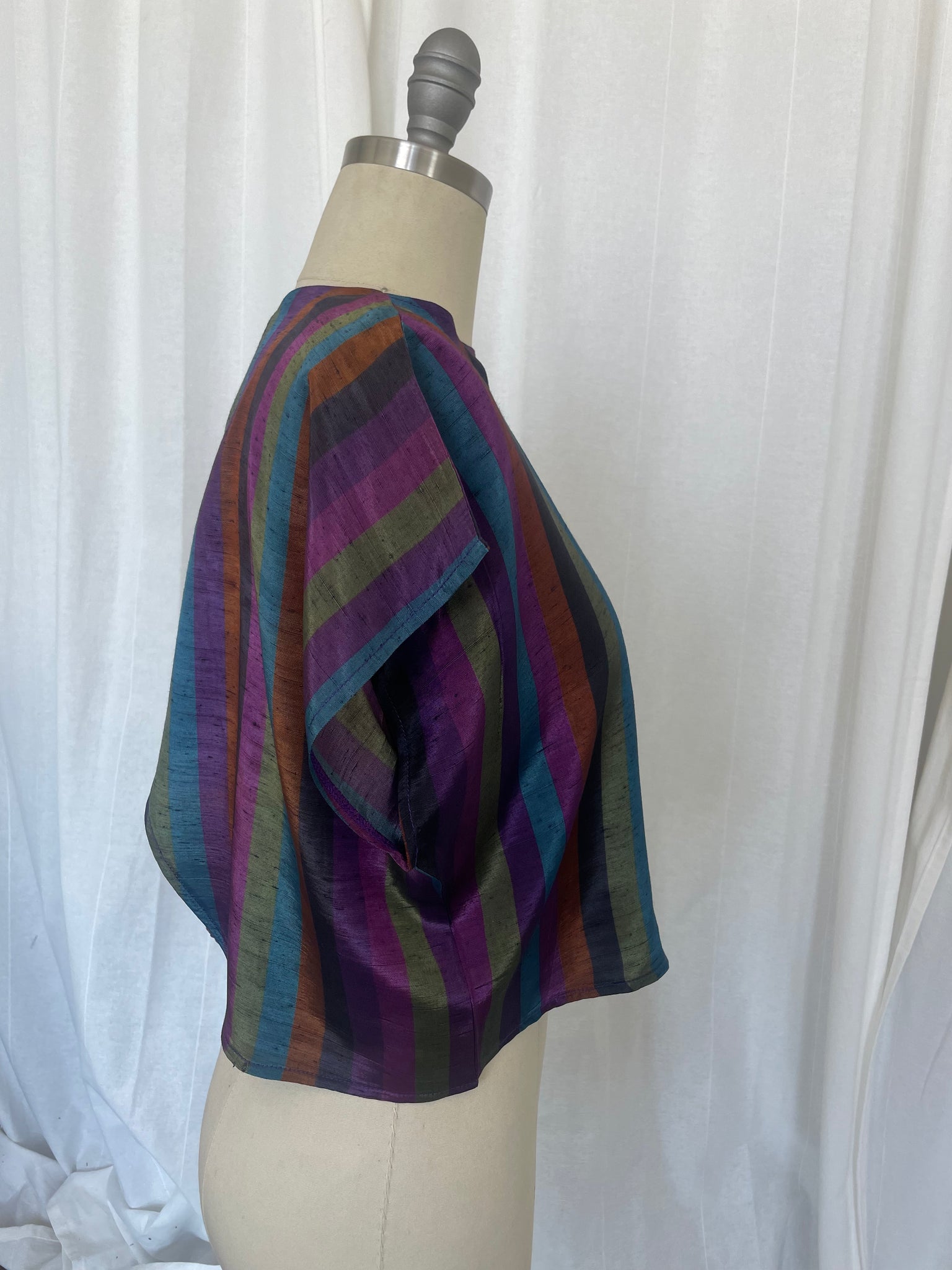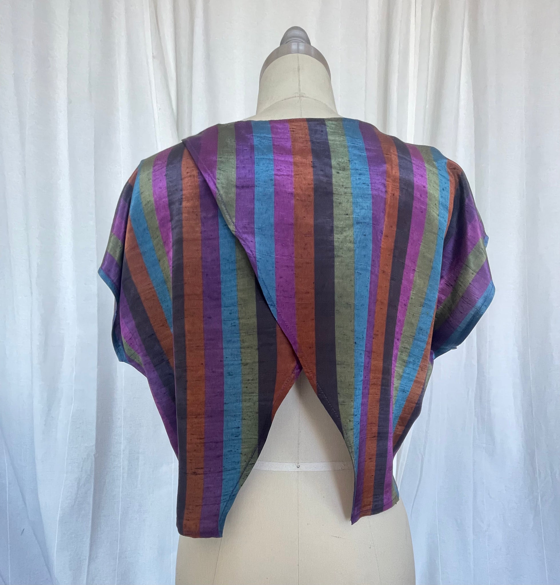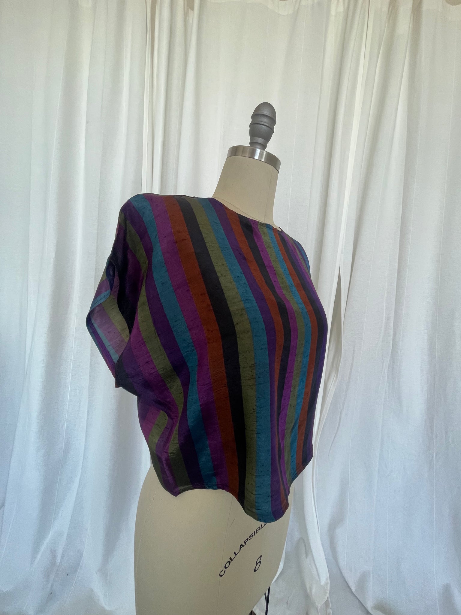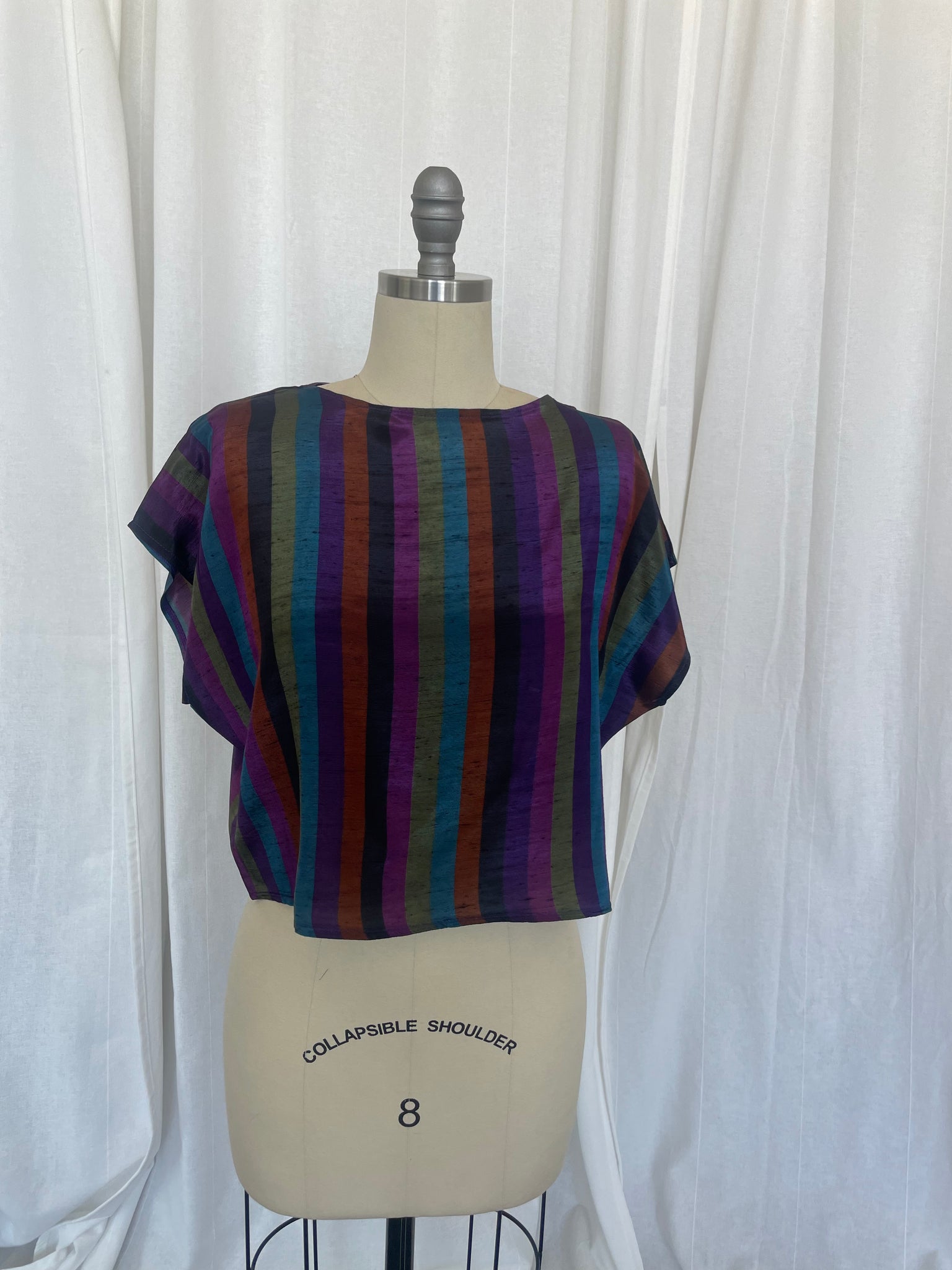 The Striped Top features an open back and loose fit cap sleeve in a multicolored striped poly blend. Designed and made by The Taste Studio Read more